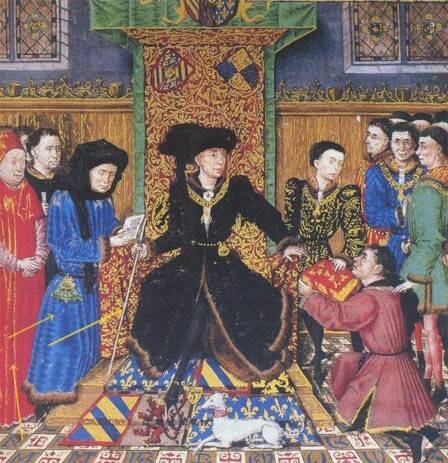 Bij al zijn 'culturele missies', waaronder dit bezoek aan Van Eijck, werd de hertog, altijd gekleed in het zwart, voortdurend vergezeld door de kanselier, Nicolas Rolin, gekleed in het blauw, en kardinaal Nicollò Albergati, gekleed in het rood (zie hieronder).