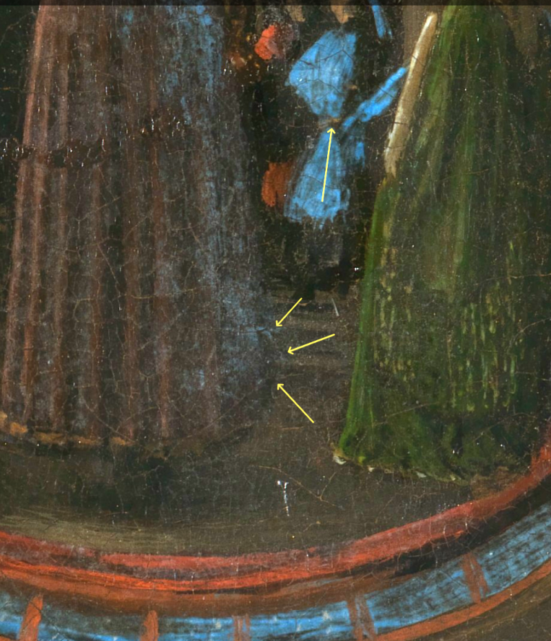 Het feit dat ze onherkenbaar zijn, suggereert dat hun aanwezigheid belangrijker is dan hun identiteit. Een probleem met deze reflectie is dat het niet mogelijk is om onderscheid te maken tussen de hond en de aan elkaar gevouwen handen. Als je echter zo ver mogelijk inzoomt op de spiegel, zie je een stukje van de hond en de aan elkaar gevouwen handen van het koppel. Deze trompe-l'oeil laat zien dat de schilder twee verschillende scènes heeft afgebeeld. één heel dichtbij, de ander een paar stappen achteruit. Let ook op de kleine schommelstoel linksonder de man, die een wieg zou kunnen symboliseren.